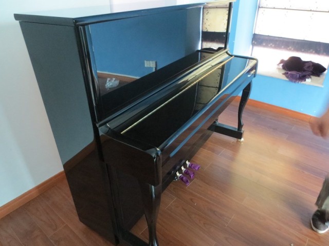 走路時(shí)必須注意,鋼琴不能過(guò)度傾斜,它與地面的斜度不能超過(guò)70度。搬動(dòng)時(shí),鋼琴背朝墻,鍵盤(pán)朝樓梯扶手。二個(gè)在下,三個(gè)在上,最好用寬布條背在肩上搭著鋼琴的車(chē)腳。與此同時(shí),雙手抓住琴背的手柄和鍵盤(pán)下面(不能拉鋼琴的腿),將鋼琴抬起,一鼓作氣移到地面,然后休息。尤其注意,鍵盤(pán)的一側(cè)不要碰扶手,腳不要碰樓梯。拐彎到第一個(gè)樓層的時(shí)候要小心碰撞,調(diào)整好方向后再抬起向上。進(jìn)入房間時(shí),還要小心擦拭門(mén)框,確保最后將鋼琴安全地放在已安排好的位置。